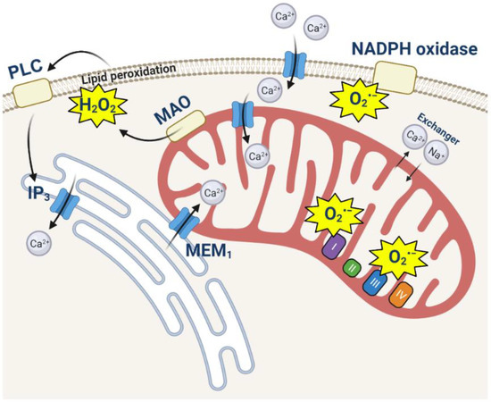 Ca2+ stimulates ROS production from different sources; thus, calcium signaling can trigger the activation of the NADPH oxidases expressed in neurons and astrocytes—NOX2 and NOX4 [23,24]. Mitochondrial calcium uptake induces the activation of dehydrogenases and mitochondrial respiration and the hyperpolarisation of mitochondria [25]. An increase in the mitochondrial membrane potential leads to a higher probability of electron leaks and ROS production in mitochondria [26].