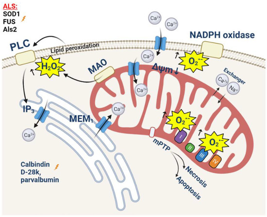 The mechanism of motor neuron degradation mediated by calcium homeostasis disorders and ROS overproduction is shown in the non-cell-autonomous model of ALS [131]. In this experiment, WT motor neurons were cultivated in astrocyte-conditioned media (ACM) containing toxic products of astrocytes expressing SOD1G93A. An increase in the excitability of neurons due to a higher level of Nav-channel permeability and an increase in the concentration of calcium in the cytosol in mitochondria was shown [131]. This led to a decrease in the mitochondrial membrane potential and an increase in ROS production and the opening of the mPTP. The overproduction of ROS also leads to the phosphorylation of apoptosis-inducing tyrosine kinase (cAbl) [131]. As a result, approximately 50% of motor neurons die within a few days [162,163,164].