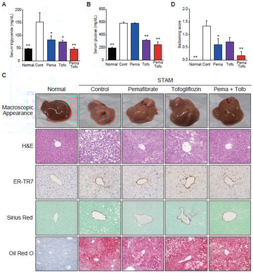 To investigate the effects of Pema and Tofo combination on NASH development in the STAM mouse model, each drug and combination was administered for three weeks. STAM mice showed significant hyperglycemia and hypertriglyceridemia; higher phospholipid, FGF21, and AST levels; lower body weight; and higher liver weight, compared to normal C57BL/6J mice (Table 1). Pema significantly reduced serum TG levels, but it did not alter serum glucose (Figure 1A,B), AST, and ALT levels. In addition, Pema significantly increased liver weight, which is a well-known effect of PPARα stimulation in rodents [,]. Tofo significantly reduced serum TG and glucose levels (Figure 1A,B). Pema and Tofo combination treatment effectively reduced serum TG and glucose levels and increased FGF21 levels.