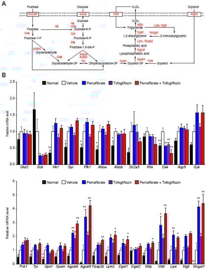 Increased glucose and fructose uptake in hepatocytes accelerate glycolysis and DNL to generate TG. Especially, the glycerolipid synthesis pathway (glyceroneogenesis) and the monoacylglycerol pathway are key players in TG synthesis (Figure 2A). The STAM control mouse livers exhibited higher levels of glycolysis-related gene expression than the normal mouse livers (Supplementary Figure S3 and Figure 2B). In addition, we found that glyceroneogenesis and re-esterification of 2-monoacylglycerol were induced in STAM control livers, in addition to simultaneous TG uptake and hydrolysis. The Pema and Tofo combination treatment did not affect glycolysis-related gene expression, but it significantly induced a series of genes involved in TG synthesis from glycerol 3-phosphate and re-esterification from monoacylglycerols and diacylglycerols generated by TG hydrolysis in STAM mouse livers (Figure 2B). These results suggest that the Pema and Tofo combination enhances the uptake and oxidation of fatty acids, TG synthesis from glycerol 3-phosphate, and the re-esterification of glycerol generated by TG hydrolysis in STAM mouse livers.