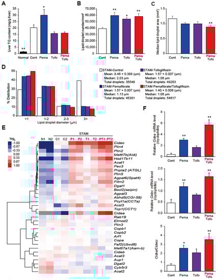 Pemafibrate and Tofogliflozin combination induces lipid droplets formation. (A) Liver TG content, (B) Lipid droplet number, (C) Median lipid droplet, (D) Lipid droplet sizes distribution, (E) Heatmap of hierarchical clustering of LDAPs and formation-related genes, and (F) Cidea, Cidec, and Cidea/Cidec ratio of control, pemafibrate, tofogliflozin, and pemafibrate and tofogliflozin combination-treated STAM mice. * p < 0.05; ** p < 0.01: Significantly difference from STAM control group by Dunnett’s multiple comparison test.