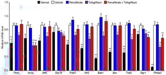 LD biogenesis and enhanced esterification of fatty acids play a key role in buffering toxic lipid species [,,]. Several reports have indicated that fatty acid accumulation in hepatocytes can lead to cell dysfunction and cell death through endoplasmic reticulum (ER) stress [,]. UPR signaling is mainly driven by three sensors mediated by inositol requiring enzyme 1 α (IRE1α), protein kinase RNA-like endoplasmic reticulum (ER) kinase (PERK), and activating transcription factor 6 (ATF6) [,]. In addition, the luminal side of each UPR sensor interacts with chaperones of immunoglobulin-binding protein/glucose regulatory protein 78 (BiP/GRP78) [,,]. Livers from the STAM control group showed enhanced UPR sensors (Ire1a, Perk, and Atf6), chaperones (Grp78 and Pdi1a), antioxidant defense-regulated transcription factor (Nrf2), IRE1α interaction protein form apoptosis mediator complex (Traf2), and proapoptotic BCL-2 protein family (Bak1 and Bax). Pema and Tofo combination significantly reduced Ire1a, Grp78, Xbp1, and Phlda3 expression levels (Figure 4). Recently, ER stress in hepatocytes has been reported to induce PHLDA3 via the IRE1–Xbp1s pathway, which facilitates liver injury by inhibiting Akt []. These data suggest that the combination of Pema and Tofo prevents liver injury by inhibiting the IRE1α-XBP1-PHLD3A pathway.