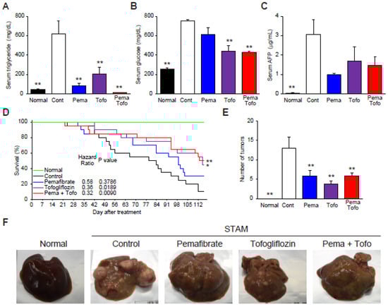 Finally, to determine whether Pema and Tofo combination can prevent the progression of NASH to HCC, we treated STAM mice for 16 weeks. As observed in the 3-week drug treatment on NASH progression, the combination of Pema and Tofo treatment resulted in a significant decrease in serum TG and blood glucose levels (Figure 5A,B). Levels of serum AFP, an oncofetal protein that is used as a tumor marker, significantly increased in the STAM vehicle control group and decreased in the combination treatment group (Figure 5C). Kaplan-Meier survival curves show that the survival rate of the control group decreased to 10%. Pema in the diet showed a tendency to increase the survival rate (30%), and the combination of Pema and Tofo significantly improved the survival rates (50%) compared to the control group. In addition, each drug-treated group had a markedly reduced number of tumors in the liver (Figure 5E,F).
