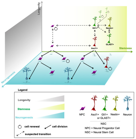 - Bast, L.; Calzolari, F.; Strasser, M.K.; Hasenauer, J.; Theis, F.J.; Ninkovic, J.; Marr, C. Increasing Neural Stem Cell Division Asymmetry and Quiescence Are Predicted to Contribute to the Age-Related Decline in Neurogenesis. Cell Rep. 2018, 25, 3231–3240.e3238. [Google Scholar] [CrossRef]