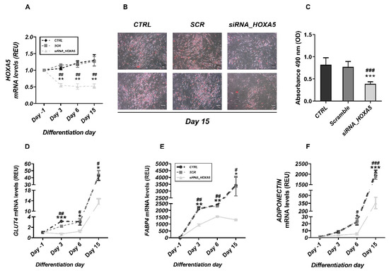 Effect of HOXA5 silencing on the differentiation of human preadipocytes. (A) HOXA5 mRNA levels were measured by qPCR at different time points during differentiation in cells treated with HOXA5-specific siRNA (siRNA_HOXA5), scrambled siRNA (SCR), or control (CTRL). All data are presented as means ± SD of 3 independent experiments. Statistical significance was tested by one-way ANOVA followed by Tukey’s multicomparison test at each indicated time. ** p < 0.01 versus CTRL; ## p < 0.01 versus SCR. (B) CTRL cells and cells treated with SCR or siRNA_HOXA5, at differentiation day 15, were stained with Oil Red O and then subjected to phase contrast microscopy. Representative fields are presented. (C) The lipid quantitation was determined by measuring absorbance at 490 nm as described in the Materials and Methods section. Expression levels of GLUT4 (D), FABP4 (E), and ADIPONECTIN (F) were assessed by qPCR at the indicated times during differentiation. All data are presented as means ± SD of 3 independent experiments. Statistical significance was tested by one-way ANOVA followed by Tukey’s multicomparison test at each indicated time point: * p < 0.05; ** p < 0.01; *** p < 0.001 for comparison versus CTRL; # p < 0.05, ## p < 0.01, ### p < 0.001 versus SCR.