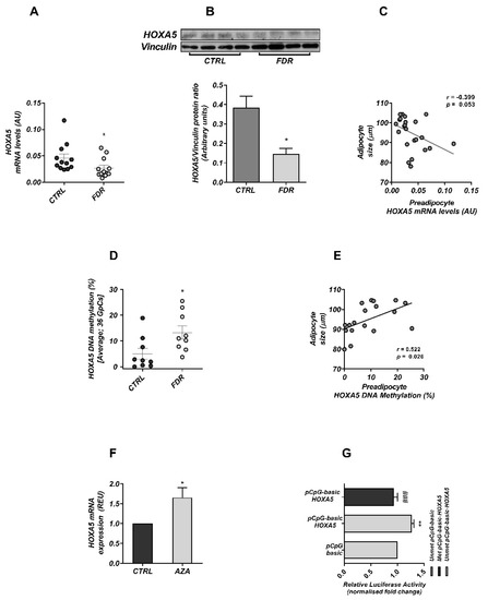 HOXA5 mRNA expression and DNA methylation in preadipocytes and correlation with the cell size of mature subcutaneous adipocytes from FDR and CTRL subjects. (A) The HOXA5 mRNA expression was measured by qPCR in preadipocytes from FDR (n = 12) and control (CTRL; n = 12) subjects as described in the Materials and Methods section. Data points represent absolute units (AU) from each individual subject. (B) HOXA5 protein levels were assessed by WB in preadipocytes from FDR (n = 4) and CTRL (n = 4) subjects available from the study group. Mean values ± SD are also shown. * p < 0.05 in a two-tailed Mann–Whitney U-test. (C) The correlation between the preadipocyte HOXA5 mRNA levels and adipose cell size was assessed in FDR (n = 12) and CTRL (n = 12) subjects. The r correlation coefficient and p-value are indicated in the graph. (D) Changes in average DNA methylation levels at 36 CpG within the HOXA5 promoter were detected by BS in preadipocytes from FDR (n = 9) and CTRL (n = 9) subjects available from the study group. Mean values ± SD are also shown. * p < 0.05 in two-tailed Mann–Whitney U-test. (E) Correlation between preadipocyte HOXA5 DNA methylation and mature adipose cell size in FDR (n = 9) and CTRL (n = 9) subjects. The r correlation coefficient and p-value are indicated in the graph. Effect of DNA methylation on HOXA5 transcriptional activity. (F) HOXA5 mRNA expression levels in preadipocytes maintained in the absence (CTRL) or the presence of 5′AZA (AZA), as described in the Materials and Methods section, were analyzed by qPCR and normalized to RPL13. Results are expressed as the mean ± SD of n = 3 independent experiments. * p < 0.05 in a two-tailed Student’s t-test. (G) A CpG-free basic plasmid with a luciferase reporter gene (pCpG-basic), where the HOXA5 minimal promoter sequence (containing 36 CpG sites; −60 bp to −565 bp from TSS,) was cloned upstream of the luciferase gene (pCpG-basic-HOXA5), was engineered. This construct was then methylated in vitro (Met) or mock-treated (Unmet) and transfected in ChubS7 cells, as reported in the Materials and Methods section. The relative luciferase activity was normalized against the activity of a cotransfected internal vector. The results are the mean ± SD of three independent experiments. The statistical significance was tested by one-way ANOVA followed by Tukey’s multicomparison test: ** p < 0.01 versus pCpG-basic; ### p < 0.001 versus unmethylated pCpG-basic-HOXA5.