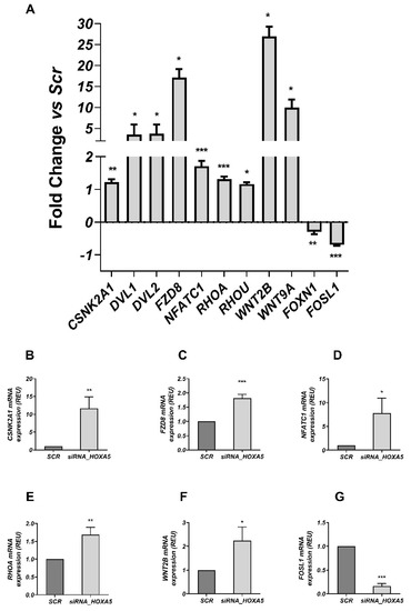 Differential expression of genes embedded in the WNT-signaling pathway in human preadipocytes upon HOXA5 silencing (PCR array PAHS-043ZD). (A) Eighty-four WNT-related genes were analyzed using the RT2 Profiler™ PCR Array (n = 3 per group/condition). The expression of 11 genes changed significantly in the HOXA5-silenced preadipocytes compared to cells transfected with scrambled siRNA (SCR). Data analyses were performed using web-based analysis software as described in the Materials and Methods. Data are presented as a fold-change relative to scramble-treated cells. Levels of significance were section: * p < 0.05; ** p < 0.01; *** p < 0.001. The 11 differentially expressed genes, identified by the RT2 Profiler™ PCR array, were individually analyzed by qPCR in the same samples also tested in the PCR array (n = 3 per group/condition). (B–G) Six of 11 differentially expressed genes were confirmed by qPCR assay. All data are expressed as means ± SD. The statistical significance was tested by two-tailed unpaired t-test. * p < 0.05; ** p < 0.01; *** p < 0.001 versus SRC.
