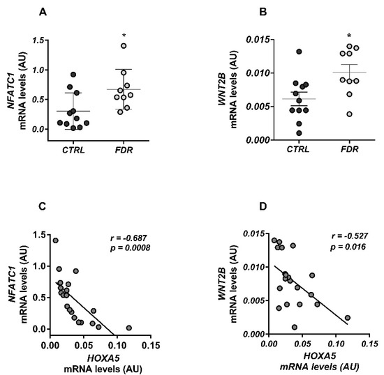 NFATC1 and WNT2B expression and their correlation with HOXA5 mRNA levels in preadipocytes from FDR and CTRL subjects. (A,B) The NFATC1 and WNT2B mRNA expression was measured by qPCR in preadipocytes from FDR (n = 9) and control (CTRL; n = 11) subjects available from the study group. Data points represent arbitrary units (AU) from each individual subject. Mean values ± SD are also shown. * p < 0.05 in a two-tailed Mann–Whitney U-test. (C,D) Correlation between the preadipocyte NFATC1 and WNT2B mRNA and HOXA5 gene expression in FDR (n = 9) and CTRL (n = 11) subjects available from the study group. The r correlation coefficient and p-value are indicated in the graph.