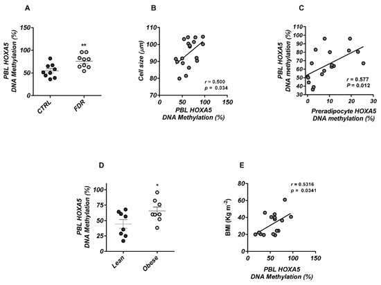 HOXA5 DNA methylation in peripheral blood leukocytes from FDR and CTRL subjects. (A) Changes in average DNA methylation levels at 36 CpG within the HOXA5 promoter were detected by BS analysis in PBL from FDR (n = 9) and CTRL (n = 9) subjects available from the study group. Mean values ± SD are also shown. ** p < 0.01 in a two-tailed Mann–Whitney U-test. (B) Correlation between the PBL HOXA5 methylation and the mature adipose cell size or (C) with the preadipocyte HOXA5 methylation in FDR (n = 9) and CTRL (n = 9) subjects available from the study group. The r correlation coefficients and p-values are indicated in the graph. HOXA5 methylation in peripheral blood leukocytes from obese and lean subjects. (D) BS analysis of the HOXA5 promoter in PBL from obese (n = 8) and lean (n = 8) subjects from the replication cohort. Data points represent the DNA methylation percentage at the HOXA5 promoter. Mean values ± SD are also shown. * p < 0.05 in a two-tailed Mann–Whitney U-test. (E) Correlation between the PBL HOXA5 methylation and BMI in obese (n = 8) and lean (n = 8) subjects. The r correlation coefficient and p-value are indicated in the graph.