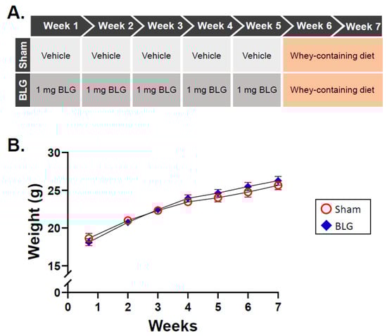 Three-week-old male C57BL/6J mice were purchased from Jackson Laboratories (Bar Harbor, ME, USA). The mice were housed five per cage under a 12 h light / 12 h dark cycle and had ad libitum access to water and a whey-free diet (Teklad 2018, Envigo Corporation, Indianapolis, IN, USA). BLG sensitization was carried out according to our prior work [47,48] with modifications. Once the mice reached 4 weeks of age, they were randomly assigned to the sham group or the BLG sensitization group and subjected to a weekly sensitization schedule for 5 weeks (Figure 1A). Both treatment groups were fasted for 2 h before and after sensitization to ensure the absence of ingesta. The BLG-sensitized group was gavaged with 200 µL sodium carbonate/bicarbonate buffer (pH 9.0) containing 10 µg cholera toxin (CT; List Biologicals, Campbell, CA, USA) as an adjuvant and 1 mg of purified BLG (Millipore Sigma, Burlington, MA, USA). The sham mice received only the vehicle (10 µg CT in 200 µL sodium carbonate/bicarbonate buffer). On week 6, both the sham and BLG-sensitized mice were placed on a rodent diet containing 0.3% whey protein (Teklad 8640, Envigo) and allowed to freely feed upon the diet for additional 2 weeks (Figure 1A). The mice were weighed weekly to ensure their growth was not affected by allergen sensitization or aversion to the whey diet (Figure 1B), and signs of allergic symptoms were monitored closely. All the procedures in this study were in compliance with the Guide for the Care and Use of Laboratory Animals of the National Institutes of Health and approved by the University of North Dakota Institutional Animal Care and Use Committee.