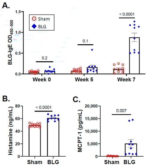 Quantification of the BLG-specific IgE, histamine, and mast cell protease-1 (MCPT-1) using ELISA. The blood samples collected from the sham and BLG-sensitized mice at weeks 0, 5, and 7 were used to detect the plasma levels of BLG-specific IgE (A). The values indicate spectrophotometric readouts at 450 nm after subtracting the reference readouts at 550 nm and are expressed as optical density (OD). Histamine (B) and MCPT-1 (C) were also quantified from the plasma and serum samples of the terminal blood, respectively, using commercial ELISA kits with respective standards. Each bar indicates the group average ± SEM (n = 10 per group). Red open circles and blue diamonds represent individual values for the sham and BLG mice, respectively. The numbers between two bars indicate the p-values. Statistical significance (p < 0.05) was determined with multiple uncorrected t-tests (BLG-specific IgE) or unpaired Student’s t-tests (histamine and MCPT-1).