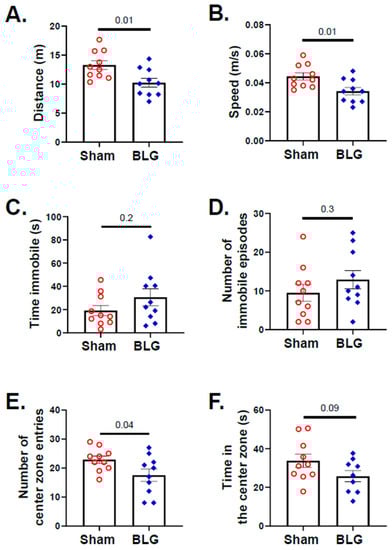 Assessment of the overall activity and anxiety-like behavior with the open-field test (OFT). All the mice were subjected to the OFT during week 7, and their activity was recorded for 10 min. The distance (A), speed (B), total time immobile (C), number of immobile episodes (D), number of center zone entries (E), and time spent in the center zone (F) were analyzed using the ANY-maze software from the recording. Each bar indicates the group average ± SEM (n = 10 per group). Red open circles and blue diamonds represent individual values for the sham and BLG mice, respectively. The numbers between the two bars indicate the p-values. Statistical significance (p < 0.05) was determined using an unpaired Student’s t-test.