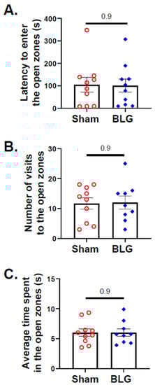Assessment of height-induced anxiety-like behavior with the elevated zero maze (EZM). The activity of mice on the EZM was recorded for 10 min. Latency to enter the open zones (A), the number of visit to the open zones (B), and the average time spent in the open zones (C) were analyzed from the recording using ANY-maze software. Each bar indicates the group average ± SEM (n = 9–10 per group). Red open circles and blue diamonds represent individual values for sham and BLG mice, respectively. The numbers between two bars indicate the p-values. Statistical significance (p < 0.05) was determined by an unpaired Student’s t-test.