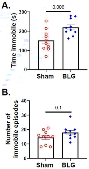 Assessment of immobility as depression-like behavior with the tail suspension test (TST). The activity of sham and BLG-sensitized mice in the suspension during the TST was recorded for 6 min. The time spent immobile (A) and the number of immobile episodes (B) were quantified from the video recording using the ANY-maze software. Each bar indicates the group average ± SEM (n = 10 per group). Red open circles and blue diamonds represent individual values for the sham and BLG mice, respectively. The numbers between the two bars indicate the p-values. Statistical significance (p < 0.05) was determined using Student’s t-test.
