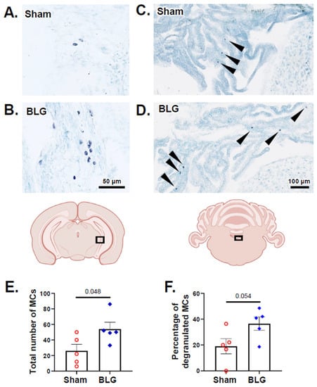 Histological detection and quantification of brain MCs identified with acidic toluidine blue staining. Metachromatically stained MCs in the brain sections from the sham (A,C) and BLG-sensitized (B,D) mice were identified using light microscopy. The MCs located in the region between the caudal thalamus/midbrain and the medial hippocampus (A,B) and the choroid plexus in the fourth ventricle (arrowheads in (C,D)) were photographed using 40× and 20× objectives, respectively. Scale bars: 50 µm (for (A,B)); 100 µm (for (C,D)). From the toluidine blue-stained sham and BLG-sensitized mouse brain sections, the number of total MCs (E) and the percentage of degranulated MCs (F) were quantified. Each bar indicates the group average ± SEM (n = 5 per group). Red open circles and blue diamonds represent individual values for the sham and BLG mice, respectively. The numbers between the two bars indicate the p-values. Statistical significance (p < 0.05) was determined using Student’s t-test.