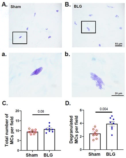 Histological detection and quantification of dural MCs identified with acidic toluidine blue staining. Metachromatically stained MCs in the dura mater from the sham (A) and BLG-sensitized (B) mice were identified using light microscopy and photographed using a 40× objective. Higher magnification images of MCs (a,b) were captured using a 100× objective. Scale bars: 50 µm (for (A,B)) and 20 µm (for (a,b)). The number of total MCs (C) and the percentage of degranulated MCs (D) were quantified from the toluidine blue-stained dural tissues collected from the sham and BLG-sensitized mice. Each bar indicates the group average ± SEM (n = 8 per group). Red open circles and blue diamonds represent individual values for the sham and BLG mice, respectively. The numbers between the two bars indicate the p-values. Statistical significance (p < 0.05) was determined using Student’s t-test.