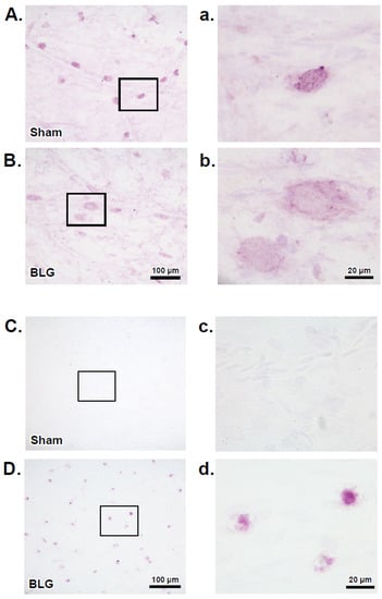 Immunohistochemical detection of FcεRI and IgE in dural MCs. Dural tissues were collected from the sham and BLG-sensitized mice with prolonged whey-containing diet and stained using antibodies against FcεRI (A,B) and IgE (C,D). The rectangles in panels A–D denote the areas where the corresponding high-magnification photomicrographs in panels a-d were taken. The immunoreactive cells were photographed with 40× (A–D) and 100× objectives (a–d). Scale bars: 100 µm (for panels (A–D)); 20 µm (for panels (a–d)).