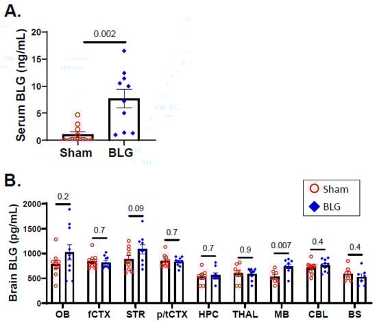 Quantitation of BLG levels in the sera and the brain. The amounts of BLG present in the sera (A) and brain lysates (B) from the sham and BLG-sensitized mice were quantified using a quantitative ELISA system for bovine BLG. Each bar indicates the group average ± SEM (n = 10 per group). Red open circles and blue diamonds represent individual values for the sham and BLG mice, respectively. The numbers between the two bars indicate the p-values. Statistical significance (p < 0.05) was determined using a Student’s t-test (serum BLG) or multiple uncorrected t-tests (brain-region specific BLG). OB: olfactory bulb; fCTX: frontal cortex; STR: striatum; p/tCTX: parietotemporal cortex; HPC: hippocampus; THAL: thalamic/hypothalamic region; MB: midbrain region; CBL: cerebellum; BS: brainstem.