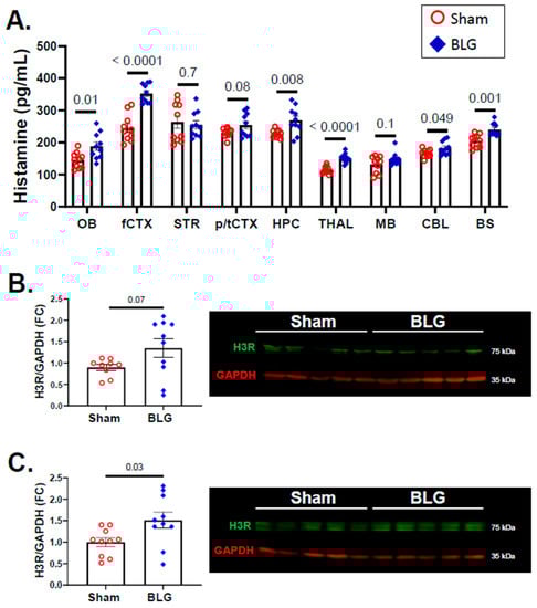 Quantitation of histamine and H3R in the brain. The histamine levels in different regions of the sham and BLG-sensitized mouse brains were quantified using ELISA (A). H3R levels from the frontal cortex (B) and the parietotemporal cortex (C) were quantified using western blotting. The fluorescence signals from the H3R bands (green bands at 65 kDa) were normalized to GAPDH (red bands at 35 kDa) in the corresponding lanes and expressed as fold change (FC) calculated from the average value of the sham mice. Each bar indicates the group average ± SEM (n = 10 per group). Red open circles and blue diamonds represent individual values for the sham and BLG mice, respectively. The numbers between the two bars indicate the p-values. Statistical significance (p < 0.05) was determined using multiple uncorrected t-tests (brain region-specific histamine) or Student’s t-test (H3R expression). One outlier was removed from the sham group in the H3R western blot analysis by ROUT. OB: olfactory bulb; fCTX: frontal cortex; STR: striatum; p/tCTX: parietotemporal cortex; HPC: hippocampus; THAL: thalamic/hypothalamic region; MB: midbrain region; CBL: cerebellum; BS: brainstem.