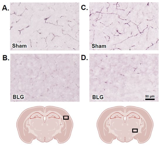 Since histamine is a known modulator of vascular permeability [58] and was elevated in the sera and brains of the BLG-sensitized mice (Figure 2B and Figure 10A), we next compared the integrity of cerebral vasculature as a measure of BBB permeability between the two groups of mice. For this purpose, the brain sections were immunostained to detect IgG extravasation into the surrounding brain parenchyma through a compromised BBB. In the sham mouse brains, we found strong IgG immunoreactivity contained within the capillaries and small vessels (Figure 11A,C). In contrast, IgG extravasation was apparent in the BLG-sensitized mice, with diffused staining throughout the brain parenchyma. This observation was particularly consistent in the cortical and thalamic regions (Figure 11B,D), staining the parenchyma darker than it appeared in the sham animals.