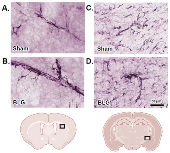 In addition to the IgG extravasation, we found that GFAP-immunoreactive (GFAP+) hypertrophic astrocytes were closely associated with some vasculature in the BLG-sensitized mouse brains (Figure 12). Based on our qualitative examination of GFAP staining across the brain sections, we found that such perivascular astrogliosis was more commonly observed with larger blood vessels (Figure 12B,D) of the CMA mice. Furthermore, a greater number of hypertrophic astrocytes were present in cerebral white matter, where GFAP+ astrocytes were more abundantly located (Figure 12C,D). This result suggested that astrocytes were stimulated to alter vascular physiology and/or relay inflammatory signaling in our BLG-sensitized mice and that their activation was sustained by chronic exposure to the allergen.