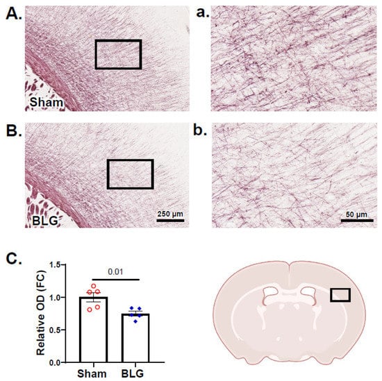 Histochemical evaluation and densitometric quantitation of Black Gold II myelin staining. Brain sections from the sham (A,a) and BLG-sensitized (B,b) mice were stained for myelin using Black Gold II. Photomicrographs were taken from the cerebral cortex at the level of the caudal striatum with 10× (A,B) and 40× (a,b) objectives. Scale bars: 250 µm (for (A,B)); 50 µm (for (a,b)). The rectangle in the brain diagram in the lower right indicates the approximate location where the photomicrographs were taken. The optical density (OD) of the staining was quantified using the QuPath software (C) and expressed as fold change (FC) calculated from the relative OD value of the sham mice. Each bar indicates the group average ± SEM (n = 5 per group). Red open circles and blue diamonds represent individual values for the sham and BLG mice, respectively. The numbers between the two bars indicate the p-values. Statistical significance (p < 0.05) was determined using Student’s t-test.