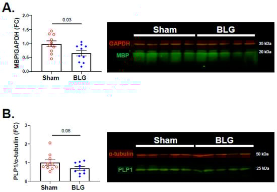 MC proteases and increased BBB permeability have been associated with demyelination [59,60,61]. In addition to white matter astrogliosis described above, MC activation, histamine elevation, and IgG extravasation were observed in our whey-fed CMA mice, leading us to question whether myelin was also affected in these animals. When the brain sections were stained with Black Gold II, the myelin staining of large white matter structures, such as the corpus callosum and the internal capsule, appeared comparable between the sham group and the BLG-sensitized group (Figure S2). However, there was noticeably less staining in the motor and somatosensory regions of the cerebral cortex in the CMA mouse brains (Figure 13A,B). A quantitative comparison of the relative OD of the staining in the frontal cortex confirmed that myelin staining was indeed significantly lower in the BLG-sensitized mice (Figure 13C; sham: 1.0 ± 0.07; BLG: 0.8 ± 0.04; p = 0.01). Furthermore, western blotting of MBP, a major protein of the myelin sheath, was significantly decreased by almost 0.5-fold in the frontal cortex of the BLG-sensitized mice (Figure 14A; p = 0.03). PLP1, another structural protein of myelin, showed a decreasing trend, though it did not reach statistical significance (Figure 14B; p = 0.08). Together, our results demonstrated the presence of cortical demyelination in our mouse model of CMA after the repeated allergen exposure.