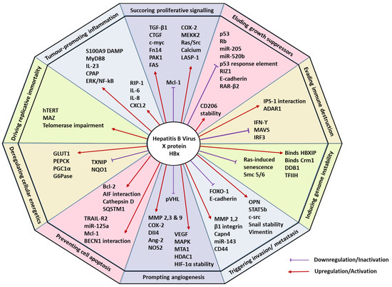 The multifunctional nature of HBx implies its involvement in altering several cellular mechanisms by hijacking the host cell homeostasis and provoking tumorigenic traits capable of inducing HCC. Such complex and distinct traits that trigger tumorigenesis and metastatic propagation, in general, have been organized into 10 major hallmarks of cancer by Hanahan and Weinberg [21,22]. These hallmarks are sustaining proliferative signalling, eluding growth suppressors, evading immune destruction, facilitating replicative immortality, aiding in tumour-promoting inflammation, triggering invasion and metastasis, prompting angiogenesis, inducing genomic instability, preventing cell apoptosis, and deregulating cellular energetics [22]. This article discusses the involvement of HBx in modulating the different hallmarks of HCC, highlighting the potential therapeutic implications. Table 1 and Figure 1 provide a summary and overview of HBx-mediated hallmarks of HCC.