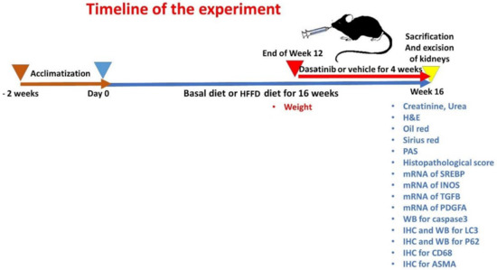 Twenty-four adult male C57BL/6 mice of wild type (weighing 20–25 g, 6–7 weeks in age) were obtained from Medical Experimental Research Center (MERC). The experiment was performed following the guidelines of Institutional Research Board (IRB), Faculty of Medicine, Mansoura University, Egypt (proposal code: R.20.12.1104.R1). Mice were applied because they have mammalian physiological systems mimicking those of humans, and males are more vulnerable to diet-induced obesity [27]. All animals were housed in MERC in stainless-steel cages under precise pathogen-free conditions (four mice/cage). All animals were kept in an environmentally controlled facility having a natural 12/12 light/dark cycle, temperature and humidity. The animals were housed for two weeks prior to the start of experiment to allow acclimatization. The mice were divided in a randomized manner into two main groups: one fed a basal Diet (BD) (n = 12) and the other one was fed an obesogenic diet (OD) (Calories; 45.3% from fat, 37% from Carbohydrates and 17.7% from protein) to induce ORC (n = 12) in accordance with the detailed diet composition used by Elsayed et al. [13]. The weights of animals were recorded at the end of the 12th week to confirm establishment of weight gain and obesity. Mice with weight >3 standard deviations of the control group were considered obese [28]. After 12 weeks, the BD (n = 12) group was randomized to 2 groups: Group 1 (n = 6) received dimethyl sulfoxide (DMSO) 5% in PBS, and Group 2 (n = 6) received Dasatinib 4 mg/kg through 4 weeks. Moreover, the OD group (n = 12) was randomized into 2 groups: Group 3 (n = 6) received 5% DMSO in PBS, and Group 4 (n = 6) received Dasatinib 4 mg/kg body weight for additional four weeks. The dose of Dasatinib was selected based on the earlier work of Hassan et al. [19], who reported that Dasatinib at a daily dose of 4 mg/kg slowed the progression of renal interstitial fibrosis via attenuating renal oxidative stress. The mice were then weighed and anaesthetized by ether inhalation then sacrificed by cervical dislocation. Both Dasatinib and DMSO were administered through oral gavage. The timeline for the study is demonstrated in Figure 1.