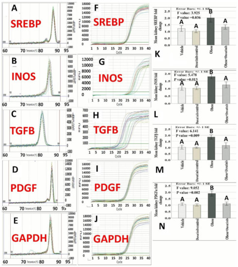Effect of Dasatinib on melting curves, amplification plotsand histograms of gene expression profiles of SREBP, iNOS, TGF-β, PDGFα and GAPDH genes as studied by qRT-PCR in the model of obeosogenic diet-induced renal damage in mice. (A–E): Melting curves of the studied genes showing single sharp peaks confirming primers specificity. (F–J): Amplification plots “Linear view” showing the threshold which was set above the baseline in the exponential portion of the plot to accurately determine the threshold cycle (Ct) of the studied genes. (K–N): Histograms of the studied genes expression showing the means ± standard errors (SE) of genes fold change. Data are mentioned as mean ± SE, different letters = significant difference. SREBP1: Sterol regulatory element binding protein; iNOS: Inducible nitric oxide synthase; TGF-β: Transforming growth factor beta; PDGFA: Platelet-derived growth factor alpha.