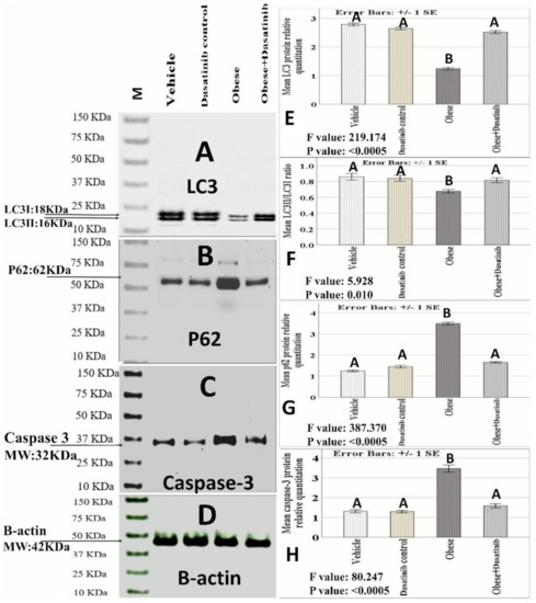 (A–D) Protein analysis by Western blotting. (A) LC3 I and II (Molecular weight: 18 kDa and 16 kDa, respectively). (B) p62 (Molecular weight: 62 kDa). (C) Caspase-3: 32 kDa). (D) β-actin: 42 kDa). (E–H): LC3II, LC3II/LC3I ratio, P62 and caspase3 proteins relative quantitation /β-actin ratio) by Western blotting. Data are mentioned as mean ± SE; different letters = significant difference). LC3: Microtubule-associated proteins 1A/1B light chain 3B. M: Marker. MW: molecular weight.