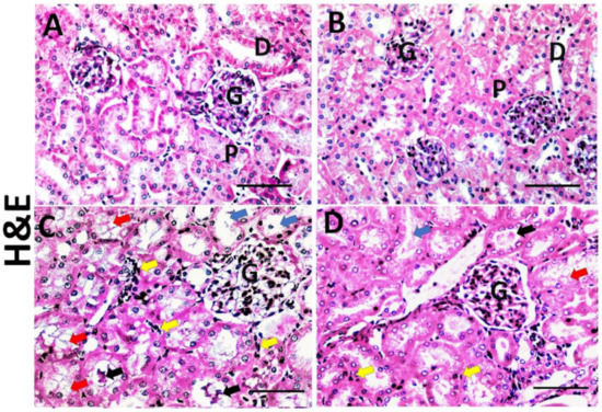 Using QIAzol reagent, the extraction of total protein from renal cortical samples was performed according to the company’s specifications. After that, protein concentrations were quantified using Bradford protein assay (Bosterbio, Pleasanton, CA, USA). Of each sample, 20 µg equal amounts was separated together with a pre-stained protein molecular weight marker (Bio-Rad, Hercules, CA, USA) via 10% SDS-PAGE [33]. After separation, protein transfer to 0.22 µm nitrocellulose membrane (Abcam, Boston, MA, USA) was performed by using Eco-Line Biometra apparatus (Gottingen, Germany); then, the membranes were incubated in 5% non-fat milk blocking buffer for 1 h at 37 °C. After blocking, an overnight membrane incubation with the primary antibodies—rabbit polyclonal antibody for LC3 and rabbit polyclonal antibody for SQSTM1/P62 as markers for autophagic activity, mouse monoclonal antibody for caspase-3 as an apoptosis marker and β-actin as a control protein (Biospes; YPA1652, ABclonal; A11250, Santa Cruz sc-7272 and Abcam ab227387, respectively)—was performed overnight at 4 °C (1:500, 1:1000, 1:100 and 1:5000 dilutions, respectively). Dilution of primary antibodies was performed in a blocking buffer, followed by incubation in an HRP-conjugated secondary anti-mouse IgG or anti-rabbit IgG antibodies (sc-516102 or sc-2357, Santa Cruz, respectively) for 1 h at room temperature [34]. The chemiluminescent substrate (ClarityTM Western ECL substrate Bio-Rad, Hercules, CA, USA) was added to the blot following the guidelines of the manufacturer, and then the chemiluminescent signal was photographed using a CCD camera-based imager. Assessment of target proteins band intensity against control protein β-actin was performed using ChemiDoc MP imager.