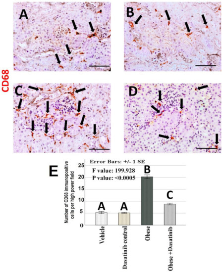 (A–D): Immunohistochemical staining for CD68 (×400) in kidney tissues of vehicle, Dasatinib control, Obesogenic diet and Obesogenic diet + Dasatinib groups (A–D, respectively). Scale bar = 50 µm. (E) The number of CD68 immunopositive cells per high power fields. Results are mentioned as mean ± standard error. Different letters mean significant difference. Arrows = CD68 + ve cells.