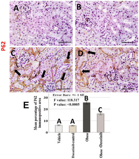 (A–D): Light-microscopic image of renal tissue with P62 immunopositive staining (×400) in the kidney tissues of all experimental groups; vehicle, Dasatinib control, Obesogenic diet and Obesogenic diet + Dasatinib groups (A–D, respectively). Scale bar = 50 µm. (E) Morphometric analysis of the mean percentage of P62 immunopositive area. Results are mentioned as mean ± standard error. p value is presented as letters (different letters mean statistically significant difference). Arrows = P62 + ve cells.