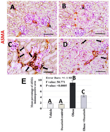 (A–D): Immunohistochemical staining for ASMA (×400) in the kidney tissues of vehicle, Dasatinib control, Obesogenic diet and Obesogenic diet + Dasatinib groups (A–D, respectively). Scale bar = 50 µm. (E) The mean percentage of ASMA immunopositive area. Results are presented as mean ± standard error. Different letters mean statistically significant difference. Arrows: ASMA + ve cells. ASMA = Alpha smooth muscle actin.