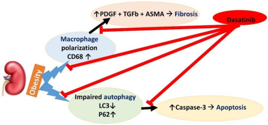 To date, there is no obviously efficient treatment for obesity-related renal changes (ORC). In this study, Dasatinib has been validated to correct autophagy impairment and attenuate lipogenesis, apoptosis and macrophage infiltration with inducing antifibrotic activity. Dasatinib is suggested to be a remarkable option for the management of ORC. Figure 10 represents a graphical scheme for the study’s findings.