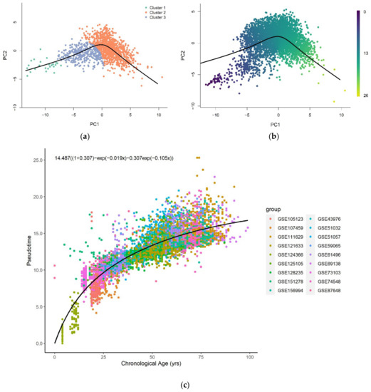 To accomplish this, we used pseudotime analysis to learn the trajectory of DNA methylation through the human aging process and to investigate the correlation between methylation pseudotime and the epigenetic state estimated by the EPM. Pseudotime analysis orders the samples based on their similarities, to assign pseudotime value as a measure of biological progress [28,29,30]. Unlike the epigenetic clocks and the EPM, pseudotime analysis does not require chronological age information or assume any specific functional form to track the methylation change.