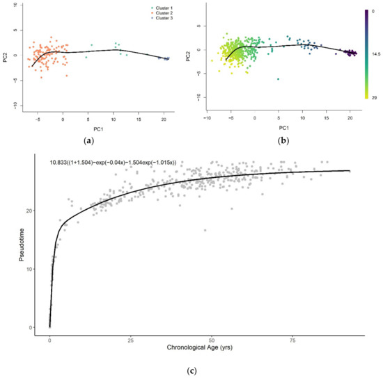 Pseudotime analysis clusters a low-dimensional representation (PC = 2) of training samples and constructs a pseudotime trajectory across the cluster centers (Figure 1a). The inferred trajectory was used to assign pseudotime values of each training (Figure A1a) and validation sample (Figure A1b) projected on the same low-dimensional space. The trained model performed well on the training (R2 = 1.00, RMSE = 0.0133) and validation (R2 = 0.996, RMSE = 0.236) datasets. Figure A2a,b shows plots of the assigned pseudotime values against the chronological age of the training and validation set respectively.