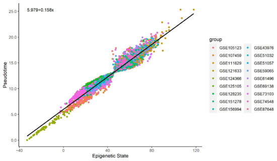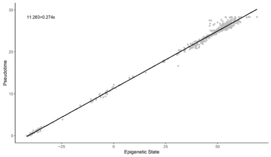 3.2. Methylation Pseudotime Is Linearly Correlated to Epigenetic States Estimated by the EPM