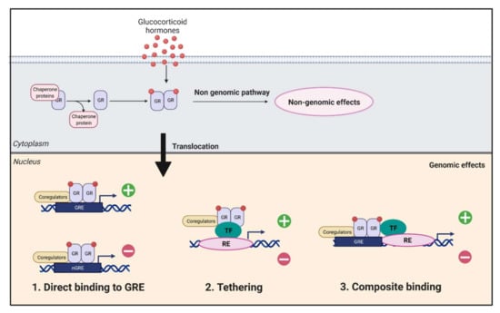 From a biological point of view, synthetic GCs, as for endogenous hormones, are liposoluble molecules that can cross the plasma membrane and bind their receptor within the cell. The GC receptor (GR, encoded by the NR3C1 gene) is thus activated and translocates to the nucleus in the form of a homodimer, where it regulates gene transcription (stimulation or repression) by directly binding to glucocorticoid response elements (GREs) []. In the absence of a ligand, GR localizes in the cytoplasm in a multiprotein complex containing heat shock proteins, immunophilins, and other chaperones, which improve the receptor’s affinity for the ligand and prevent the degradation of the receptors.