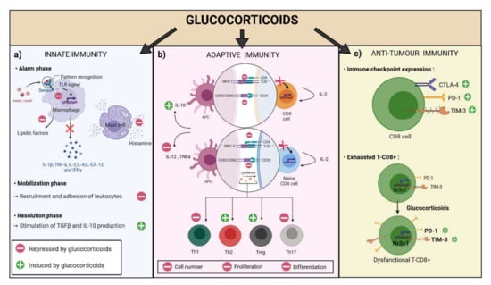 Effect of glucocorticoids on the immune system. Glucocorticoids have a role on innate, adaptive, and antitumour immunity. (a) On innate immunity, during the alarm phase, they inhibit toll like receptor (TLR) signalling, which prevents the production of proinflammatory cytokines. In addition, they inhibit the release of histamine from mast cells. The mobilization phase is impacted by a decrease in leukocytes recruitment and adhesion. The resolution phase is characterized by an increased production of TGFβ (Transforming growth factor β) and interleukin 10 (IL-10). (b) On adaptive immunity, glucocorticoids play an important role because they inhibit the co-stimulation of the antigen-presenting cell (APC) to T-CD8+ or T-CD4+ lymphocytes by decreasing the expression of major histocompatibility complex (MHC) type I and II molecules and decreasing the expression of CD28 and CD80 molecules. In addition, T-cell proliferation is decreased by alteration of T-cell receptor (TCR)-initiated signalling and thus decreased IL-2 production. Glucocorticoids also have a role on the polarization and differentiation of naive CD4-T cells by inhibiting T helper 1 (Th1) and 17 (Th17) differentiation and promoting T helper 2 (Th2) and T regulator (T-reg) differentiation. (c) On anti-tumour immunity, glucocorticoids induce the expression of immune checkpoints, such as the cytotoxic T-cell associated protein 4 (CTLA4), programmed death receptor 1 (PD-1), and mucin-3 T-cell immunoglobulin (Tim-3). They also promote an exhausted and therefore dysfunctional phenotype of CD8+ lymphocytes through the co-expression of PD-1 and TIM-3 receptors (created with BioRender).