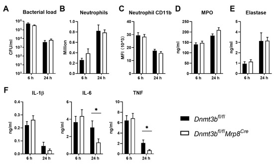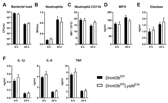 Dnmt3b is a de novo methyltransferase that has been widely studied as a regulator of DNA methylation [20]. More recent studies implicated Dnmt3b in the regulation of the host immune response during bacterial infection in general and P. aeruginosa infection in particular [2,10,11]. Neutrophils are the first cells recruited upon infection of the airways by P. aeruginosa, where they play a crucial role in host defense against this bacterium [21,22]. To determine the role of Dnmt3b in neutrophils during Pseudomonas pneumonia, we crossed Mrp8Cre mice, which specifically targets floxed gene segments in neutrophils [23] with Dnmt3bfl/fl mice to generate neutrophil-specific Dnmt3b knockout (Dnmt3bfl/flMrp8Cre) and littermate control (Dnmt3bfl/fl) mice, and infected these with PAK via the airways. Dnmt3b but not Dnmt3a mRNA level in neutrophils of naïve Dnmt3bfl/flMrp8Cre mice was significantly lower than that of littermate control mice (Figure S1), confirming the neutrophil-specific knockout of Dnmt3b in Dnmt3bfl/flMrp8Cre mice. Bacterial loads and neutrophil numbers in BALF were similar in both mouse strains at 6 and 24 h after infection (Figure 1A,B). Likewise, neutrophil activation, determined by quantification of cell surface CD11b expression and by measuring the neutrophil degranulation products MPO and elastase in BALF was comparable in Dnmt3bfl/flMrp8Cre and control mice at both time points after Pseudomonas infection (Figure 1C–E). BALF levels of the proinflammatory cytokines IL-1β, IL-6, and TNF were similar in both mouse strains at 6 h after infection. At 24 h, cytokine concentrations had decreased in both groups but to a greater extent in Dnmt3bfl/flMrp8Cre mice than in control mice (significantly so for IL-6 and TNF; Figure 1F). Taken together, these data indicate that neutrophil Dnmt3b does not affect key immune responses or antibacterial defense during P. aeruginosa pneumonia.