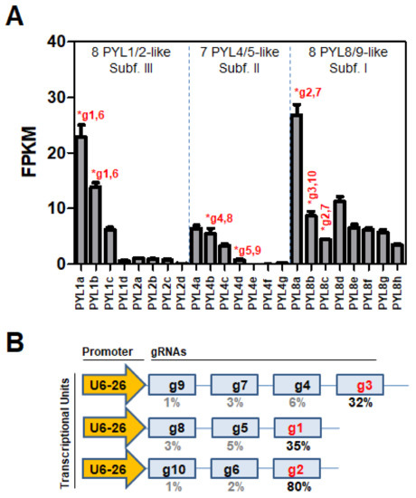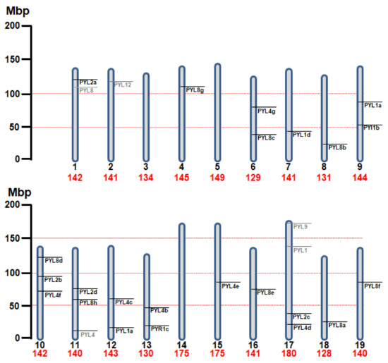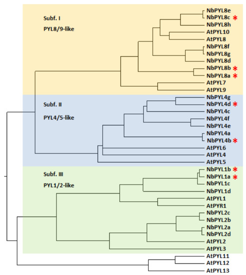 - Bai, G.; Xie, H.; Yao, H.; Li, F.; Chen, X.; Zhang, Y.; Xiao, B.; Yang, J.; Li, Y.; Yang, D.H. Genome-wide identification and characterization of ABA receptor PYL/RCAR gene family reveals evolution and roles in drought stress in Nicotiana tabacum. BMC. Genom. 2019, 20, 575. [Google Scholar] [CrossRef] [PubMed] [Green Version]
