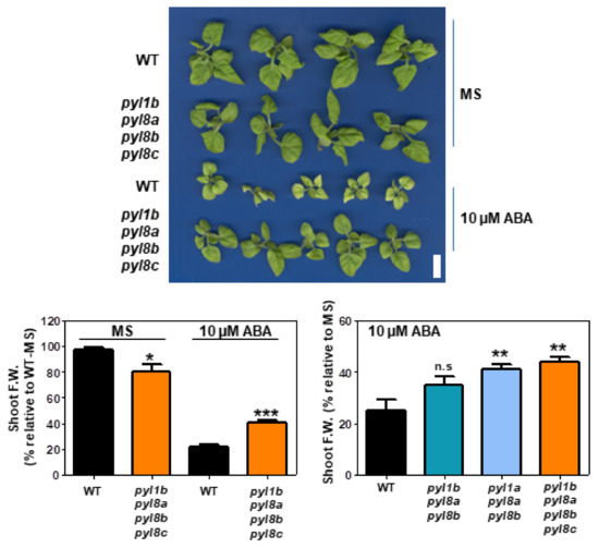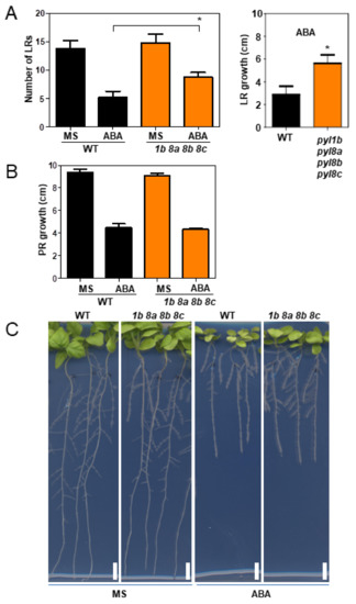 - Belda-Palazon, B.; Gonzalez-Garcia, M.P.; Lozano-Juste, J.; Coego, A.; Antoni, R.; Julian, J.; Peirats-Llobet, M.; Rodriguez, L.; Berbel, A.; Dietrich, D.; et al. PYL8 mediates ABA perception in the root through non-cell-autonomous and ligand-stabilization-based mechanisms. Proc. Natl. Acad. Sci. USA 2018, 115, E11857–E11863. [Google Scholar] [CrossRef] [Green Version]