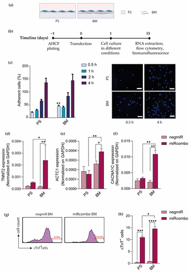 Furthermore, flow cytometry analysis showed a significantly higher percentage of cardiac troponin T (cTnT)-positive cells (14.6%) for miRcombo-transfected AHCFs cultured for 15 days on BM-coated dishes compared to negmiR controls (Figure 2g) and to uncoated PS plates (~11% cTnT-positive cells as reported in our previous study [11]) (Figure 2h). Hence, BM coating was found to increase the direct reprogramming efficiency of miRcombo-transfected AHCFs into iCMs.