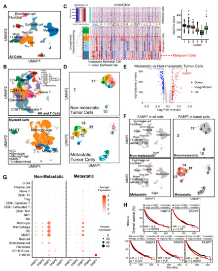 FABP7 is highly expressed in NSCLC cells. (A) UMAP visualization of all cells in the single-cell dataset colored by identified cell types. (B) UMAP visualization of NK and T cells (top) and myeloid cells (bottom) in the single-cell dataset colored by identified cell types. (C) Identification of tumor cells. Inferred copy number variations (CNVs) patterns of each chromosome (shown by different color bars) were compared between normal cells (Reference Cells) and epithelial cells from tumor tissues (Observation Cells). A higher inferCNV score (right) represents a higher CNVs degree of the cluster. The red dash line box shows malignant cells with obvious CNVs and higher inferCNV scores. (D) UMAP visualization of tumor cells from non-metastatic (top) or metastatic (bottom) patients. (E) Volcano plot of differentially expressed genes (DEGs) between tumor cells of metastatic and non-metastatic patients. Expressions with adjusted p-value < 0.05 are shown in red (log2 Fold change > 1) or blue (log2 Fold change < −1), while those with adjusted p-value > = 0.05 are shown in grey. (F) FABP7 Expression of all main cell types (left) or tumor cells (right) split by patients with or without metastasis. Expression levels of FABP7 are labeled by the intensity of red color. (G) Average expressions of FABP3-7 in indicated cell types split by patients without (left) or with (right) metastasis. (H) Kaplan-Meier overall survival (OS) analyses of FABP3-7 in NSCLC based on KM-plotter.