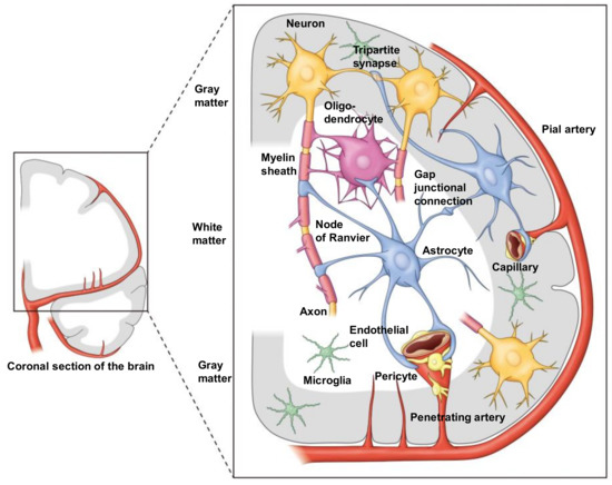 The term NVU in its current sense was first used by the Stroke Progress Review Group of the National Institute of Neurological Disorders and Stroke (NINDS) [6]. In 2001, the Director of NINDS, Gerald Fischbach, convened a group of basic and clinical researchers on cerebrovascular disease in the United States to address the need for a comprehensive understanding of the pathogenesis of stroke and to translate it to clinical application. A report was published one year later, in 2002, under the co-chairs of James C. Grotta and Michael A. Moskowitz. The members of the group included Costantino Iadecola and Gregory J. del Zoppo, who are leaders in this area of research. The report lists 15 priority areas for advancing research in cerebrovascular disease, and the second of the five goals common to all of them is “understanding the complex functions of the blood per se, vessel walls, and the brain”. The term NVU, components of which are the blood vessel wall, extracellular matrix (ECM), neurons, and glia, was coined by this group. In addition, the 4th of the 15 priority areas, namely, “Neurovascular Protective Mechanisms”, which refers to the endothelial cells and astrocytes, also involves the NVU. The NVU is defined as the sum of the endothelial cells, astrocytes and pericytes as cellular elements, and the ECM as a non-cellular element, and also the proteins and their regulatory enzymes related to these components. The group has called special attention to the roles of the “glio-vascular module” within the NVU [5,6]. However, it is generally accepted that the NVU is a structural unit that includes both the glio-vascular module and neurons. In addition, immune and inflammatory cells, such as microglia [32,33,34,35] and oligodendrocytes in the white matter [36,37,38], targets of research on cerebral white matter disorders, are also now considered to be important components of the NVU [19,20,21] (Figure 1).
