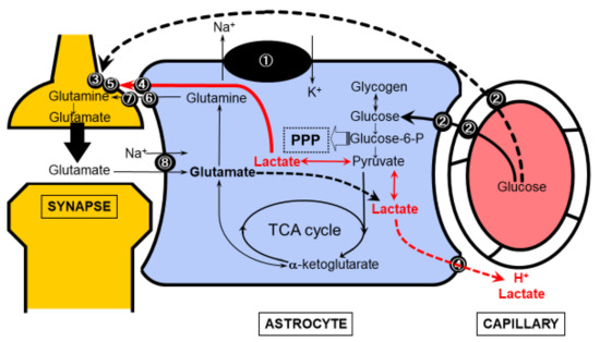 Another hypothesis suggests that astrocytes directly regulate the size of the vascular bed at the capillary level [29,30,31]. Aquaporin 4 (AQP4), which is strongly expressed in the vascular peduncle of astrocytes, is a water channel that regulates the movement of water molecules in and out of the cell; AQP4 channels are key molecules that induce cellular edema in the event of ischemic neuronal injury, but they also regulate the water content in the intracellular compartment within the astrocytes and extracellular compartment, or Virchow–Robin space, under physiological conditions. These channels monitor the metabolic state of astrocytes and close when the intracellular H+ increases due to metabolic activation, thereby inhibiting water movement out of the cells and narrowing the Virchow–Robin space [29,30,31]. This immediately dilates the capillary bed, potentially increasing the blood flow. Acidification in astrocytes is caused by various metabolic changes, and is particularly related to glucose metabolism. The astrocyte–neuron lactate shuttle (ANLS) model (Figure 2) [19,20,21], which will be discussed in the following section, lends support to the possibility that the lactate produced in astrocytes may cause acidification. An alternative pathway for lactate production may be glutamate taken up by the neurons in the glutamate–glutamine cycle. After conversion to α-ketoglutarate, glutamate undergoes metabolism in the tricarboxylic acid (TCA) cycle and may be partly involved in ATP production in the astrocytes and a source of lactate production by malic enzyme after metabolism in the TCA cycle [19,20,21].