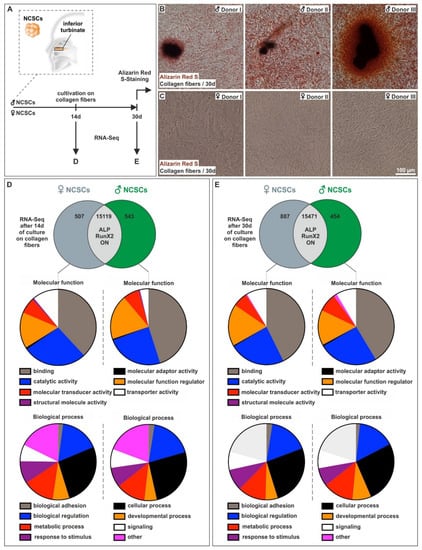 Adult human neural crest-derived stem cells from female donors showed a strong delay in osteogenic differentiation in comparison to male NCSCs. (A) Schematic depiction of the endogenous niche of craniofacial NCSCs as well as the experimental design. Scheme partly modified from []. (B,C) NCSCs from male individuals showed a strong Alizarin Red S-stained calcium deposition after culture on collagen fibers for 30 days, while no signs of Alizarin Red S-positive calcification were observable in female NCSCs. (D,E) RNA-sequencing revealed the expression of common osteogenic markers such as ALP, Runx2 and Osteonectin in NCSCs from three male and female donors after 14 and 30 days, while transcripts solely expressed in either male or female NCSCs belonged to similar GO terms.
