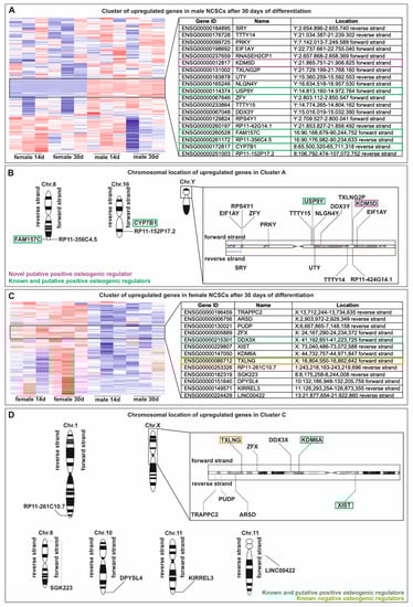 Hierarchical clustering of differentially expressed genes revealed a sexually dimorphic osteogenic regulator profile between male and female NCSCs undergoing differentiation. (A,B) Cluster of upregulated genes in male NCSCs comprising autosomal osteogenic regulator CYP7B1 as well as the Y-linked genes KDM5D and USP9Y. (C,D). Female NCSCs showed a cluster of upregulated genes including the pro-osteogenic regulators KDM6A and XIST as well as the negative regulator TXLNG.